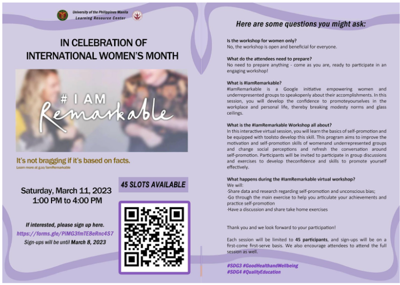 The celebration featured a diverse lineup of empowering events. These included breast and cancer screenings organized by the College of Pharmacy (CP) at the DepEd Manila Office and a Learning Resource Center-hosted face-to-face workshop titled “#IamRemarkable” on March 11.