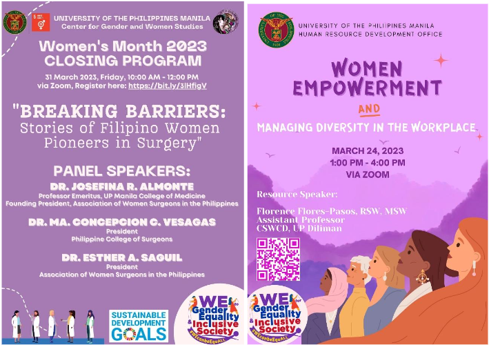 April 27, 2023 — The UP Manila Center for Gender and Women Studies (UPM-CGWS) celebrated Women’s Month 2023 with the theme “WE (Women and Everyone) for Gender Equality and Inclusive Society” signifying the collective efforts of women and everyone in the pursuit of gender equality. It also represents women’s empowerment which can only be achieved when agencies, mechanisms, institutions, private partners, and duty-bearers at the national and local levels provide women with equal rights and opportunities; and when women seize these opportunities to further their progress.