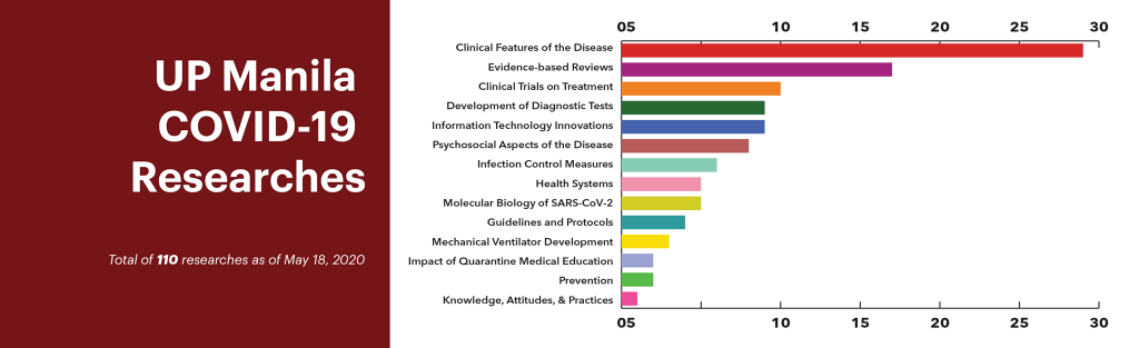 Part of the UP Manila response to The Covid 19 pandemic is conducting researches on topics related to the virus. As of 18 May 2020, the total number of researches done is 110.
