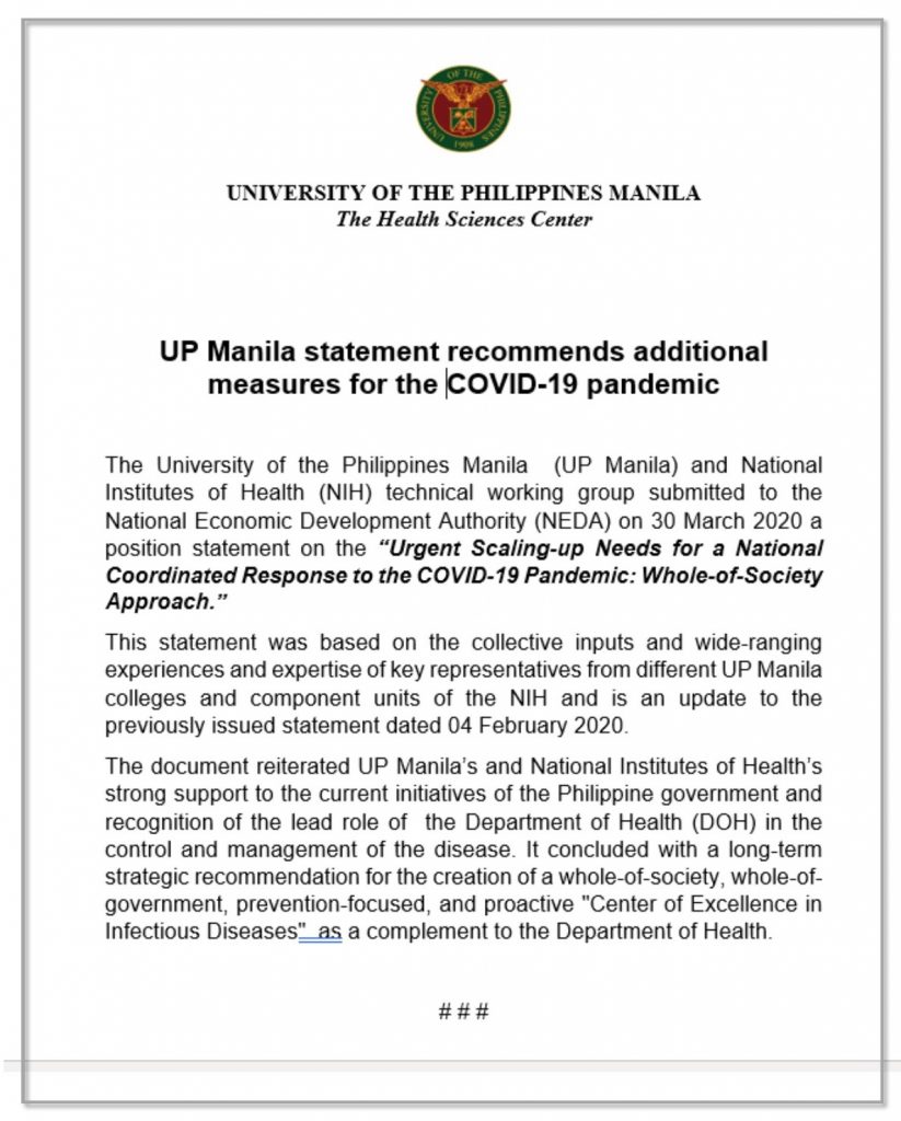 UP Manila statement recommends additional measures for the Covid-19 pandemic