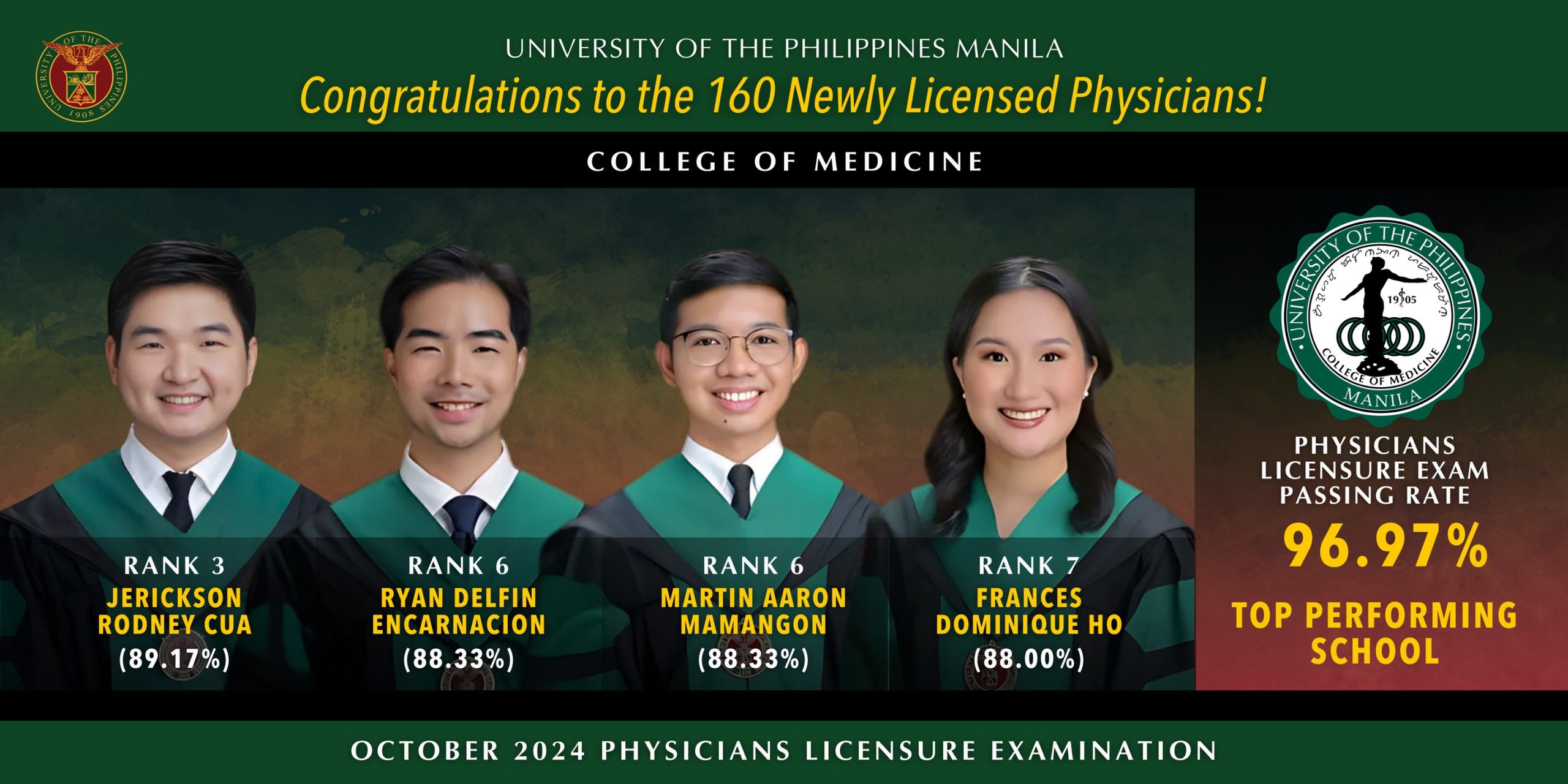 The University of the Philippines College of Medicine (UPCM) celebrates 160 new doctors who hurdled the October 2024 Physician Licensure Examination, as well as earning the title of top-performing school with a 96.97% passing rate. Among the top examinees were Jerickson Rodney Cua (3rd, 89.17%), Ryan Delfin Encarnacion and Martin Aaron Mamangon (6th, 88.33%), and Frances Dominique Ho (7th, 88.00%).