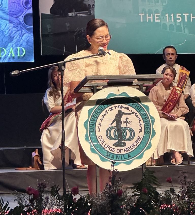 Guest of Honor, Senator Risa Hontiveros, addresses the graduates during Vidad: the 115th UP College of Medicine Commencement Exercises.